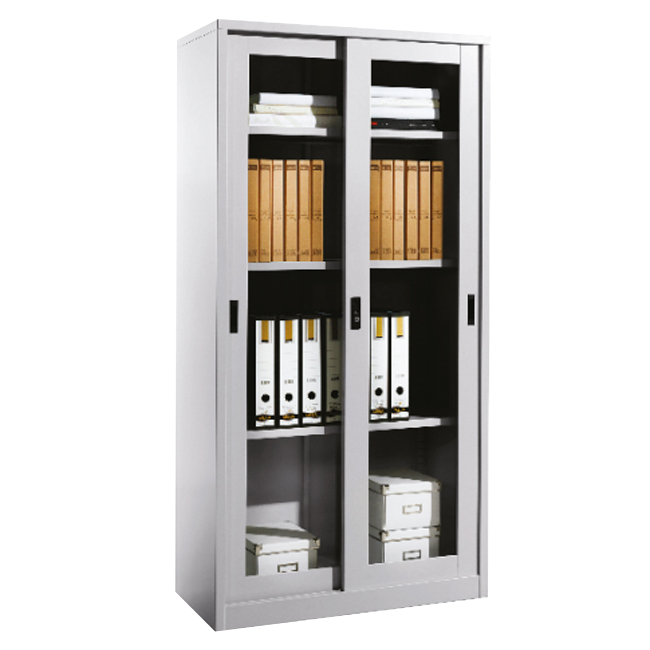 FULL HEIGHT SLIDING GLASS DOOR STEEL CUPBOARD WITH 3 SHELVES